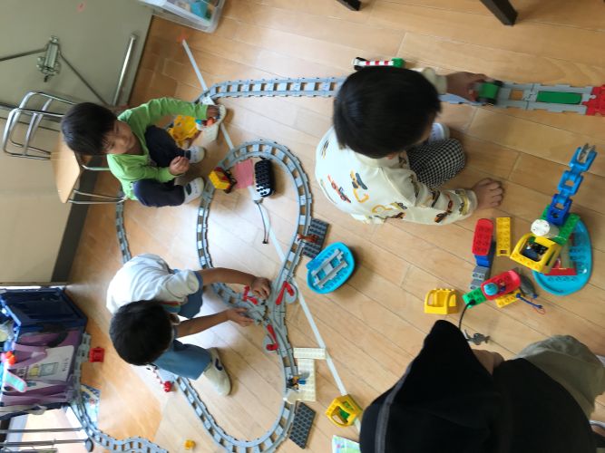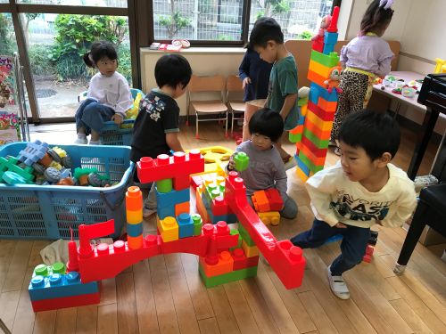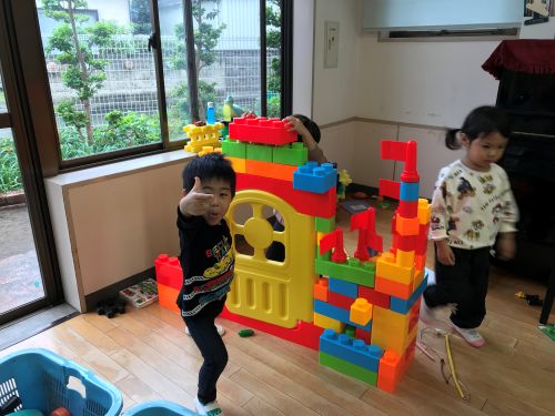 雨で運動会の予行ができなくて。お部屋で遊んでいます。新しいブロックも年少さんに入りました。