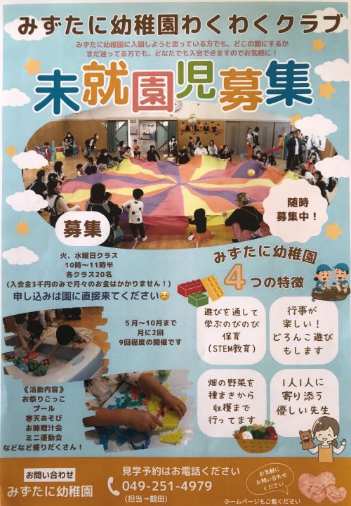 令和8年度のわくわくクラブ(未就園児教室)の募集をはじめます。お気軽にお問い合わせください。可愛いちびっ子待ってまーす。